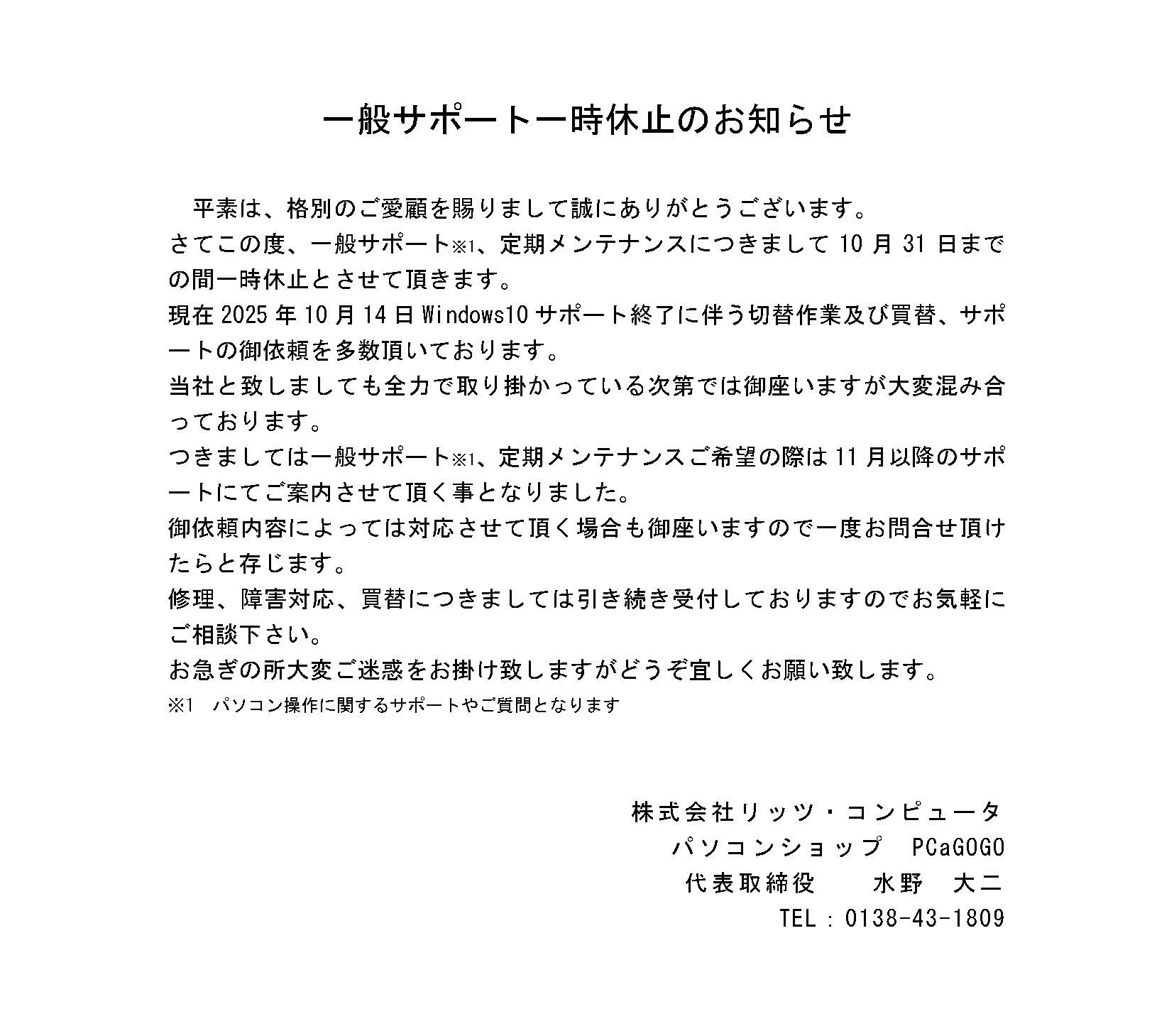 2025年10月10日 一般サポート一時休止のお知らせ